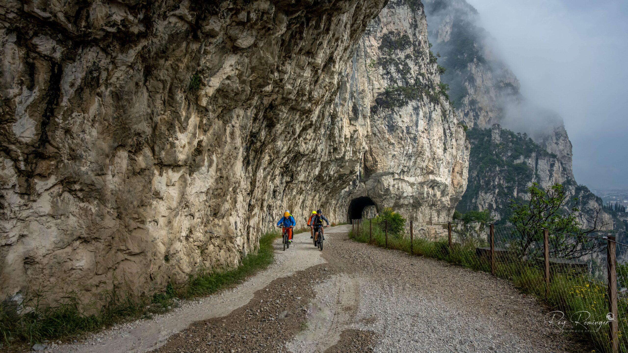 time to catch two cyclists emerging from the tunnel. The sheer cliffs, the mist, and the