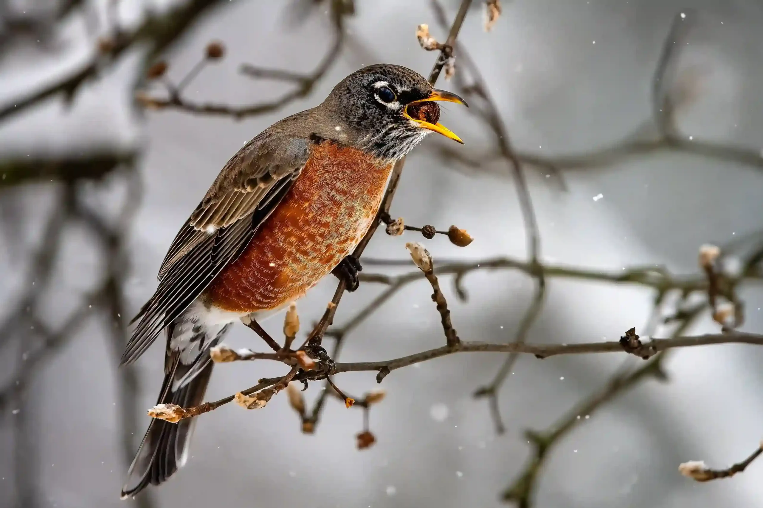 An American Robin clutches a berry in its beak, framed by gently falling snow. Its rich orange breast contrasts against the frosty background, embodying resilience and seasonal beauty.