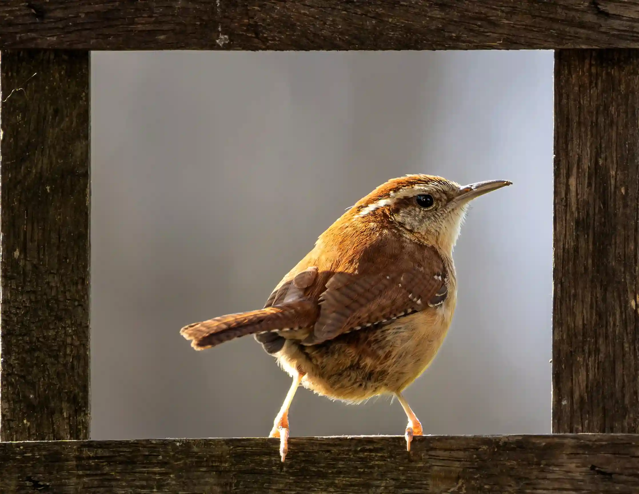 A curious Carolina Wren perches in a wooden fence opening, its cinnamon tones glowing in soft light. This intimate portrait of a beloved songbird is perfect for rustic farmhouse decor, bird lovers, or anyone who finds joy in nature.