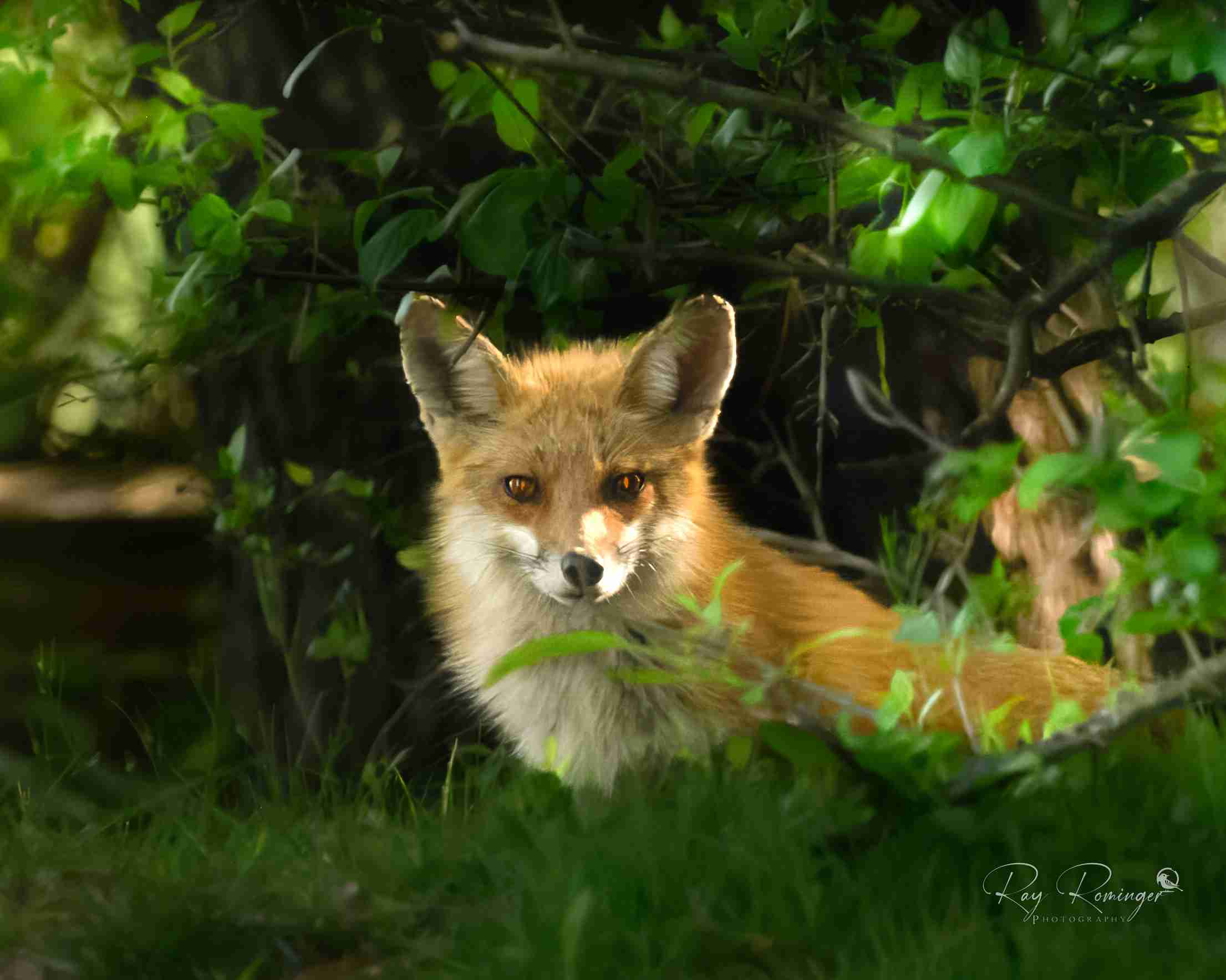 Late on a summer afternoon, I spotted this beautiful momma red fox slipping quietly in and out of the brush, as if waiting for someone. Moving slowly across the field so as not to startle her, I was able to capture this moment when the sunlight streamed through the trees, lighting up her sharp, watchful eyes. The glow made her look both mysterious and magical—wild beauty caught in a fleeting moment.