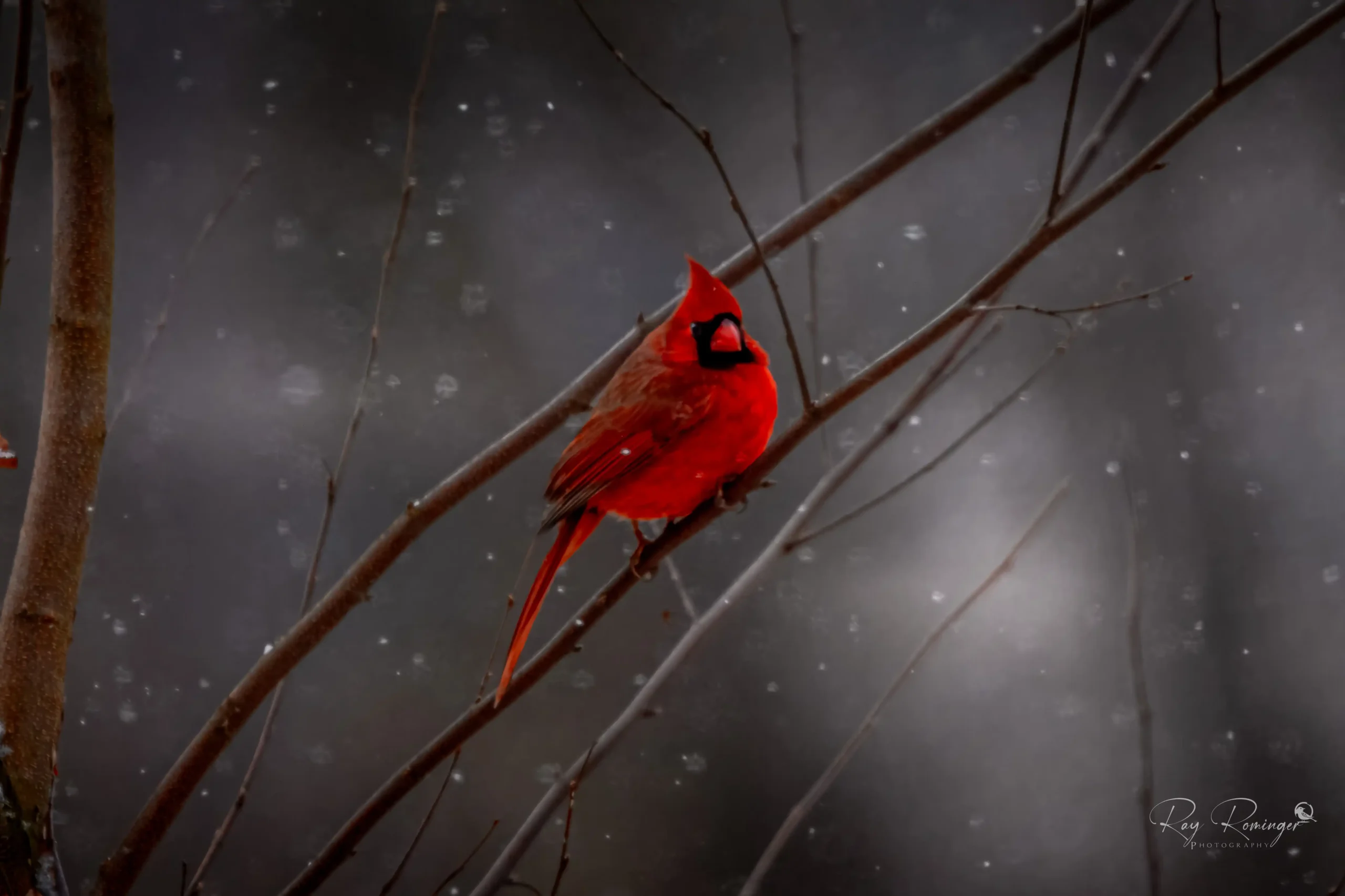 A brilliant male Northern Cardinal perches among bare branches as snowflakes drift around him. His striking red plumage glows against the gray winter forest, a timeless symbol of beauty, vitality, and hope.