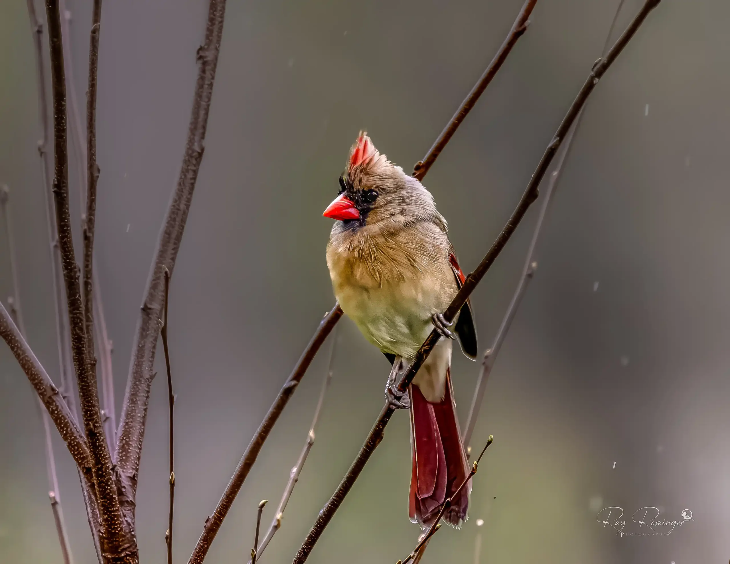 On a quiet afternoon in my backyard, this colorful female cardinal caught my eye. She carried herself with a quiet kind of beauty. Her soft golden feathers, tinged with warm orange and hints of red, glowed against the gray sky — understated, yet elegant.