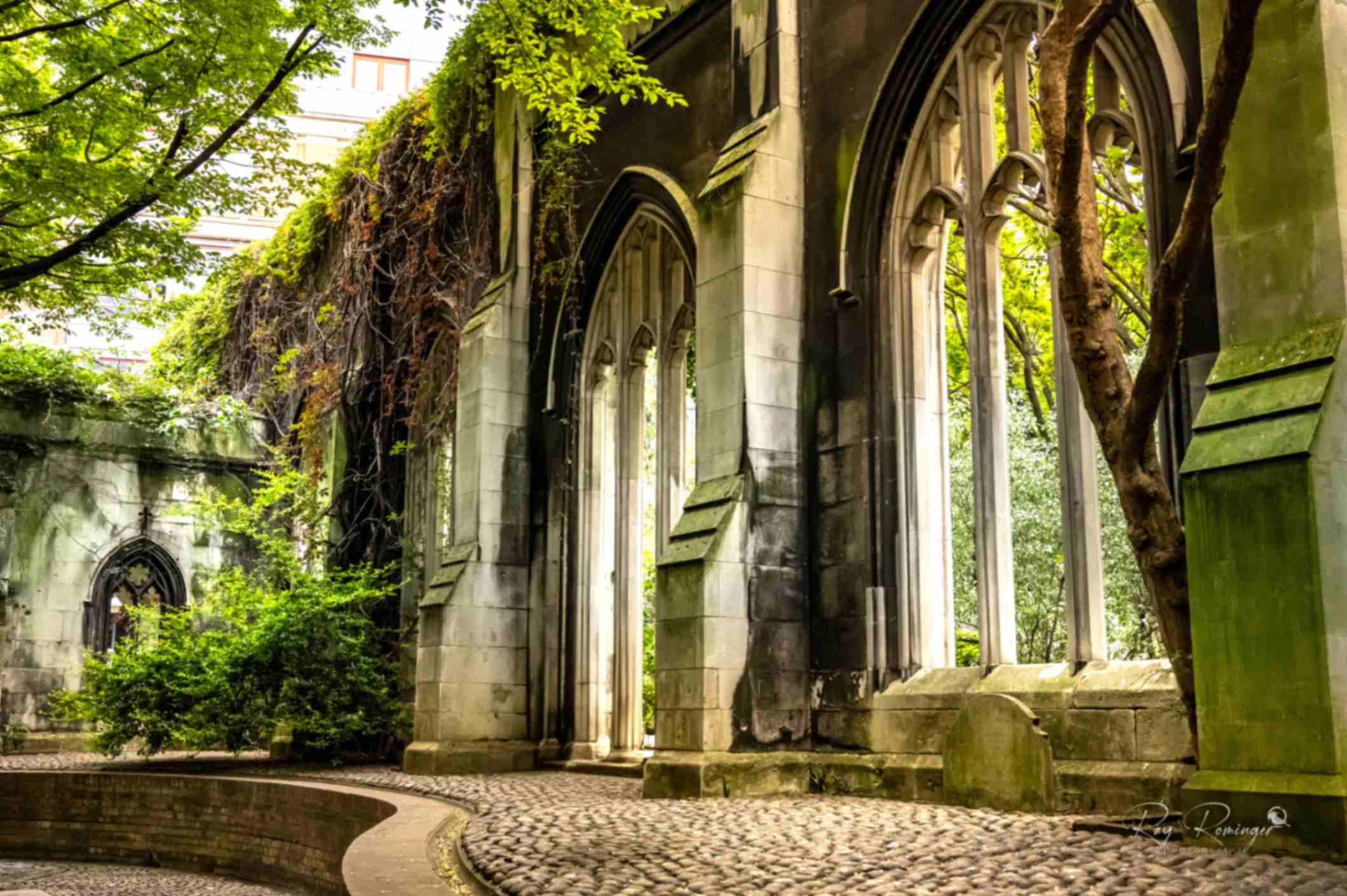the ruins of a bombed-out church in the heart of London. These historic spaces often