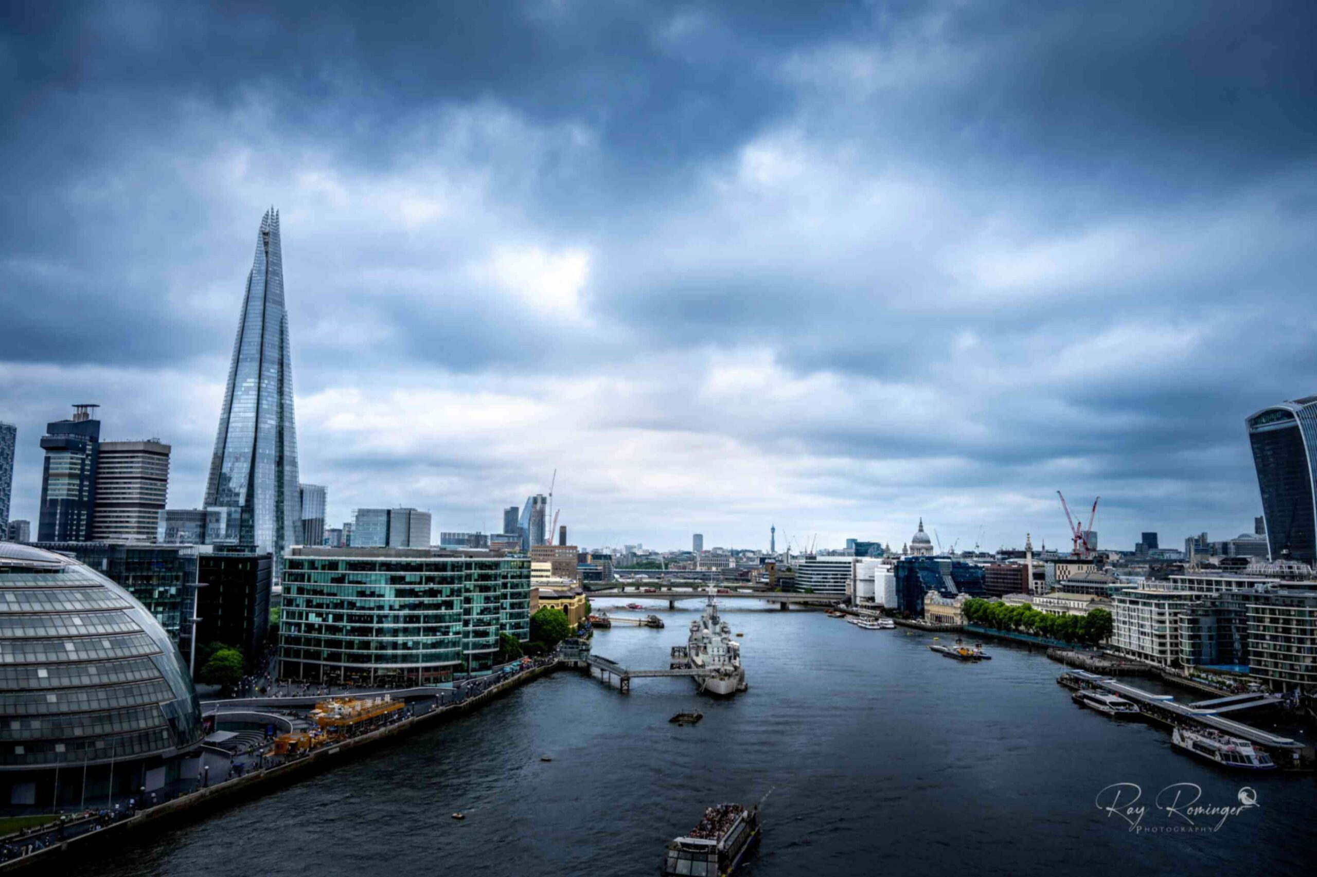 direction. Looking out across the Thames, I saw the Shard rising into the moody sky,