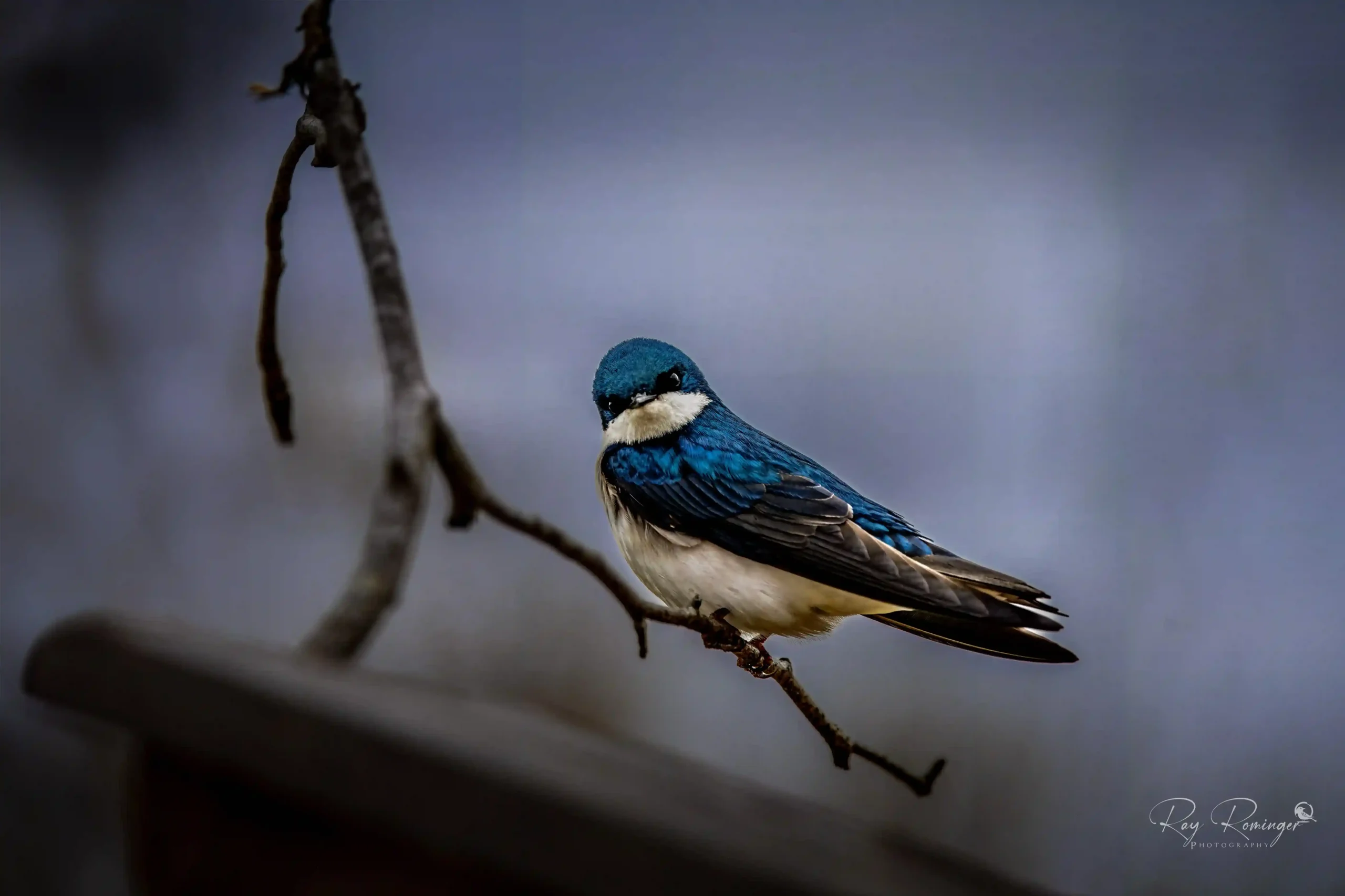A Tree Swallow perches calmly, its iridescent blue feathers glowing against the muted background. Known for their speed and grace, this portrait captures a rare moment of stillness from a remarkable bird.