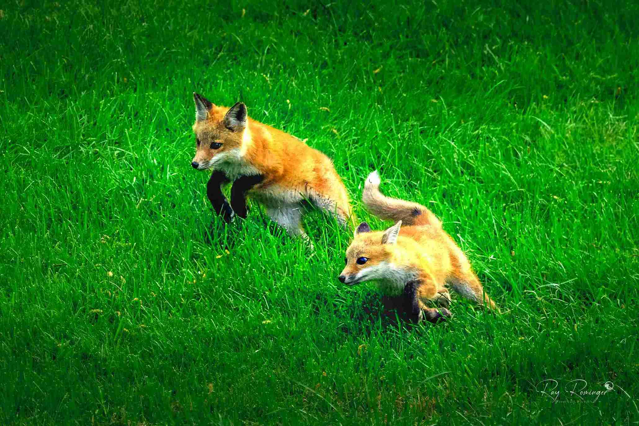 Two playful fox kits bound through green grass, full of energy and freedom. This joyful wildlife scene captures the spirit of the wild at play.