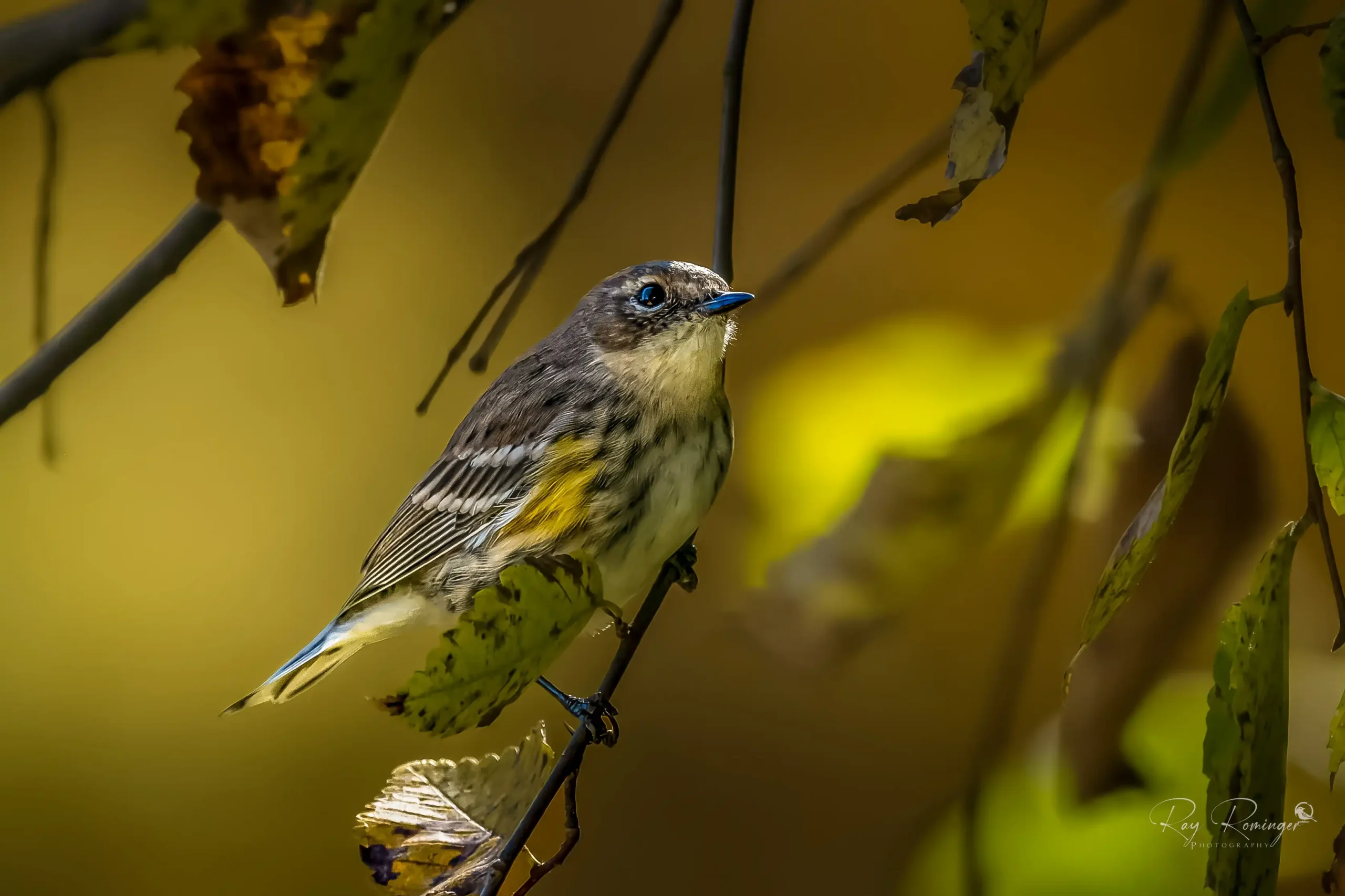 Bathed in soft golden light, the Yellow-Rumped Warbler rests on a delicate branch, its yellow markings glowing against the fading leaves. A fleeting visitor, captured in a moment of calm woodland beauty.